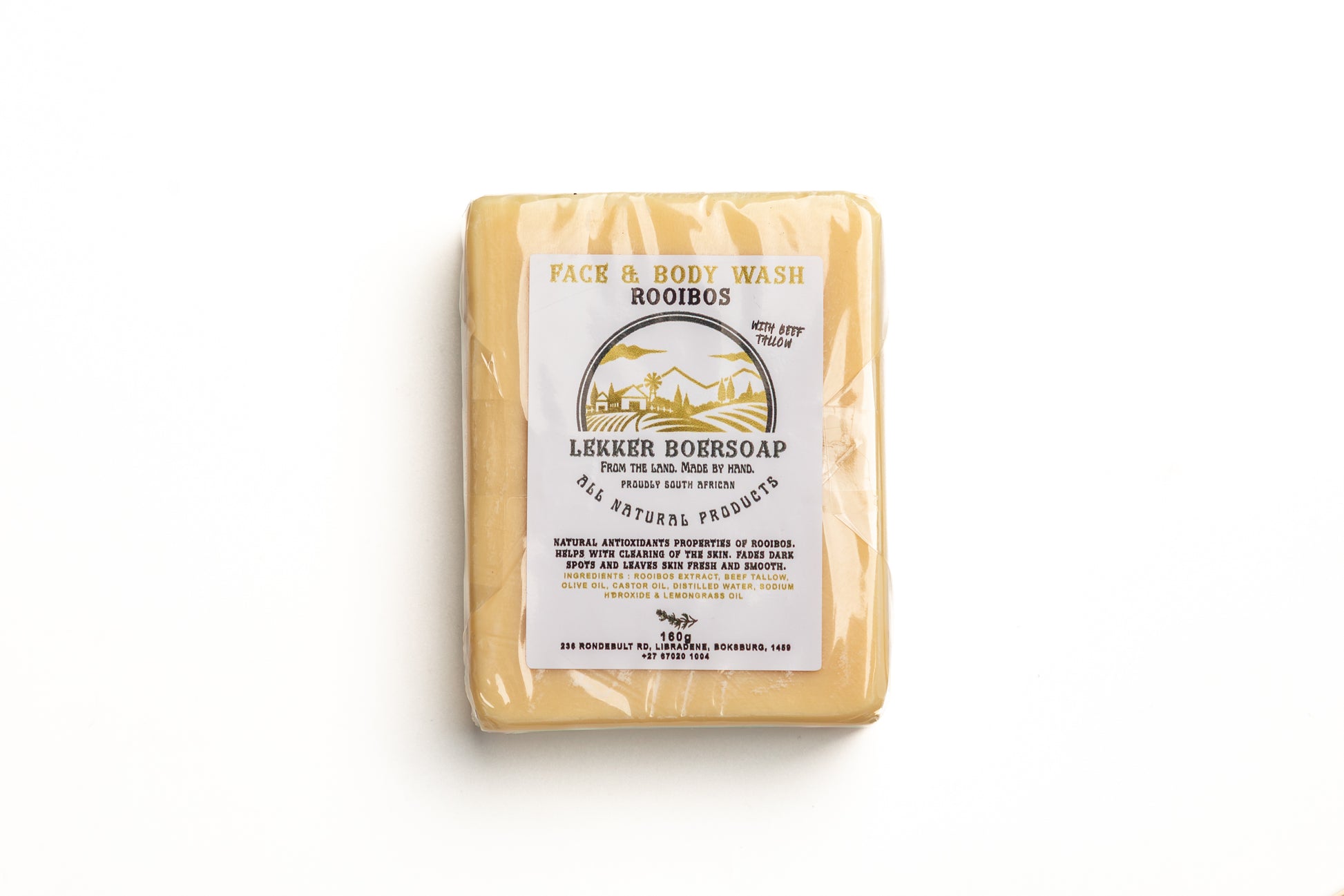 Ingredients : Rooibos extract, Beef Tallow, Olive Oil, Castor Oil, Distilled water & Sodium Hydroxide.